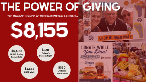 Culver's Percent Night: Our church family showed up in a big way on Monday night as we dined together at Culver's in Hope Mills! 10% of the sales made between 5:00 PM and 7:59 PM were donated towards Haymount UMC's Youth Mission Fund! Between food purchased at Culver's and cash donations made that evening, our youth were able to raise $820!
