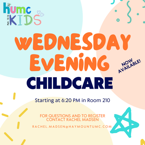 HUMC Children's Ministry now offers Wednesday Evening Childcare! Childcare will be open starting at 6:20pm in room 210 for adults who are participating in a Bible study or musical rehearsals. Reservations are accepted no later than the Monday before the Wednesday care is needed. To reserve your spot in Wednesday Evening Childcare, email Rachel Madsen at rachel.madsen@haymountumc.com