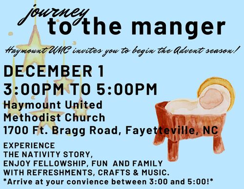 Experience a live Nativity story, fellowship with family and friends afterwards with refreshments and crafts. If you have questions or are interested in volunteering, contact Rachel Madsen at rachel.madsen@haymountumc.com